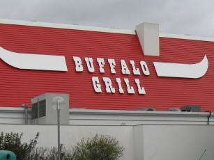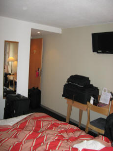 Once we got to the hotel, an adequate but small room awaited us just outside of town. We stowed our bags, then took a walk hoping to find a solution to the problem of the lack of grounding to the North American/Continental European electricity adapters we had brought. I had thought--sight unseen -- that the adapters James brought would suffice for my grounded-plug computer. I was wrong. Despite having visited a very well stocked computer/electronics establishment, we came away empty handed, resulting in the first delay of getting these Europe pages up in a timely manner. If it's not one thing, it's another. Returning to the lodgings, we decided to eat at the table d'hôte, where I supped on côte de boeuf and pommes de terre Anna, which sound very chic until you realize it's just meat and potatoes, served with a little flair. We also had a little wine. Then it was lights out with the "Buffalo Grill" marquee shining brightly just beyond our curtain, and its Friday night crowd whooping it up. Tipsy people sound the same in any language.