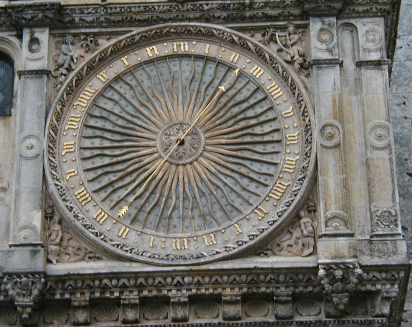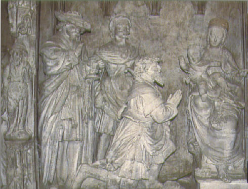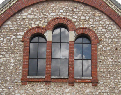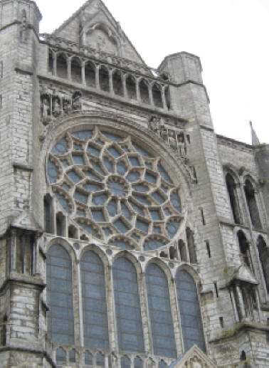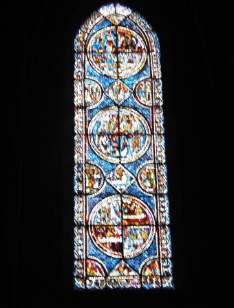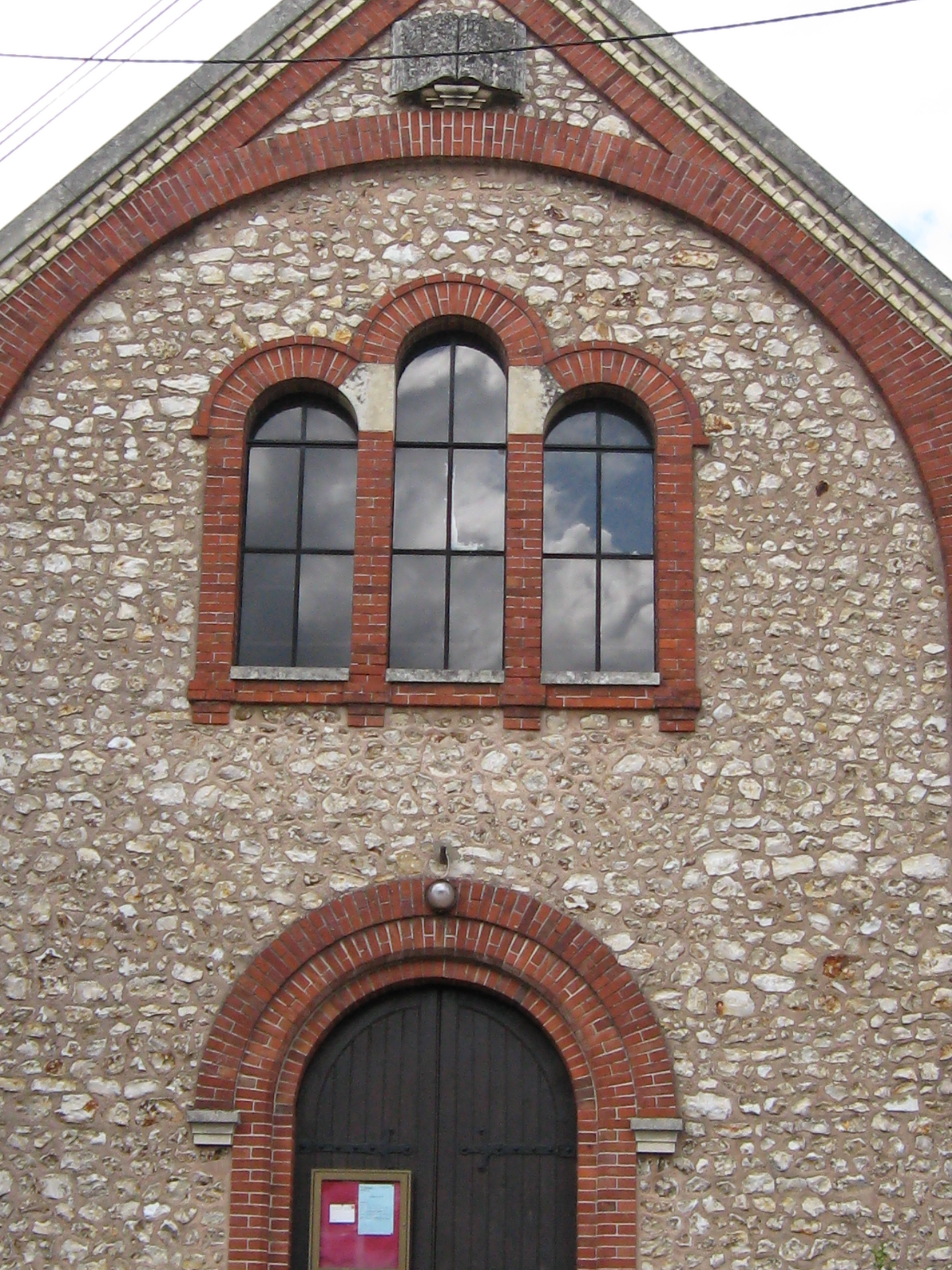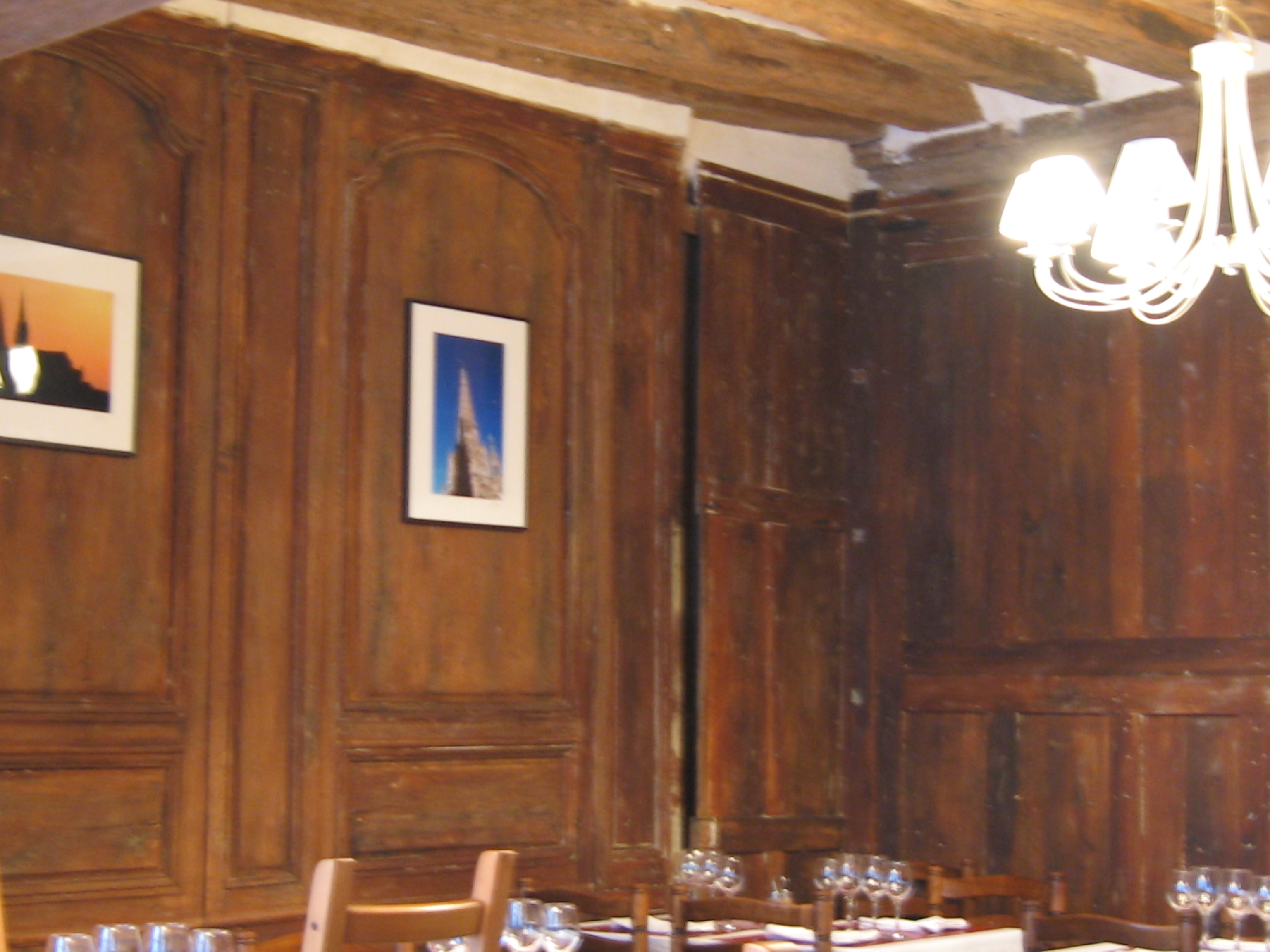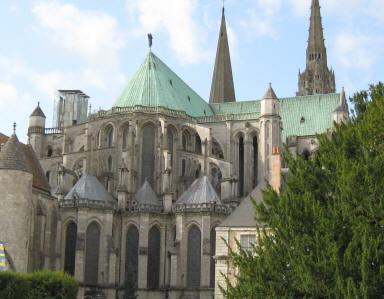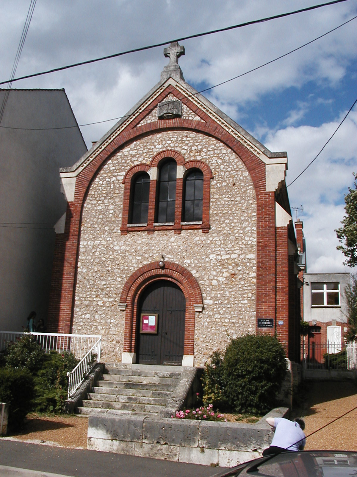 A short taxi ride landed us in the middle of the town of Chartres, at the foot of the hill on which the cathedral loomed. From the window of the restaurant where we breakfasted, we could see the south entrance and already at 8:00, visitors gathering and gawking. We walked around the periphery, including the bishops' gardens, where a gardener was on duty preparing supports for topiary, and around the west, north, and finally east portals. At the east entrance a fellow was holding a bouquet of yellow lilies and singing in French, welcoming the folks who came to see the building. Entering the cathedral, the first thing I noticed was a pronounced lack of light. Although this Gothic style of architecture was supposed to be a great improvement over the Romanesque, with the Gothic improvements in weight distribution allowing more light to stream in through the clerestory and upper tier windows, it was still dim. Perhaps this was because the sun was occluded by clouds outside; if there were more sunlight outside there would be more to come through the windows. A second discovery was that there was to be an extremely auspicious organ recital the next day: the International Organ Competition, so there were chairs set up on the famous labyrinth, making it impossible to walk it. This might force me to return at a later date, or barring that possibility, I may have to build a facsimile. Ken, any thoughts? Having spent a goodly amount of time with the cathedral, it was time to find the Reformed church digs. About a mile or so away, their church had one small sign indicating its presence; we almost missed it coming from the town, as it faced the other direction. Tucked between two houses, their simple brick and stone building stood with a lone staircase, twin doors, and a bulletin board on the outside. Worship was held once, at 10:15 on Sunday morning. Two stray cats greeted us, and we surprised a couple of teen-aged girls chatting away their afternoon at the top of the fire escape on the left side of the building. Beyond them, there was no other living being to be found. Quite a difference from the crowd at the Cathedral.
