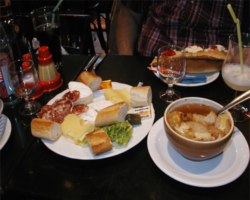 Charcuterie, fromage, French bread, and onion soup for dinner.