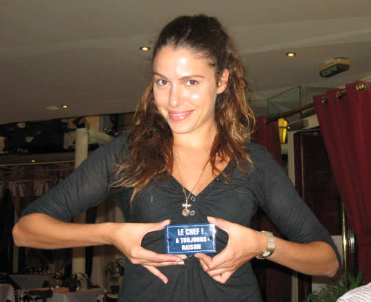 The rain eventually did lessen somewhat, but showed no sign of stopping, so we opted to return to the southeast of town, get some dinner, and call it a day.  The restaurant at which we ate last night was so good that we decided to go there again.  The same good soul who served us the night before attended us again, and was just as gracious and good humored.  Here is a picture of her holding a little magnet that says "The chef is always right!"