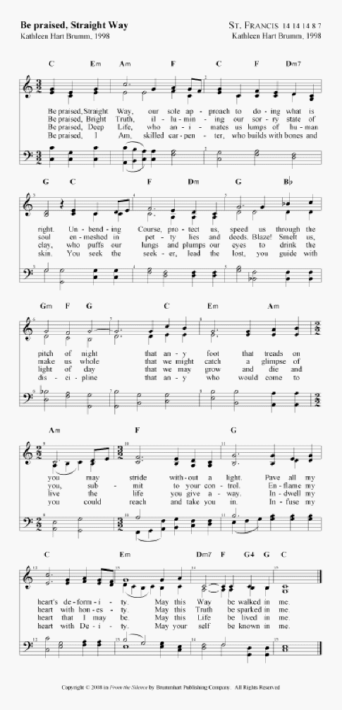 In the summer of 1998, Choristers Guild held one of their last annual Summer Seminars. During this week John Thornburg, then pastor of a Dallas Methodist church, taught a course on text writing. This is one of the texts I came up with that week, joining St. Francis of Assisi's incipit to Brother Sun, Sister Moon: "Be praised, my Lord, for. . ." with Jesus' saying in John 14:6 that he is the way, the truth and the life. In class it met with some approval, although there was no tune to which to sing it. The nearest standard meter I could find is 14. 14. 14. 7. 8.; close, but no cigar. Before long, a melody had attached itself to the text, varying slightly from one stanza to the next. This final form, which you hear, is an attempt to get all the stanzas to stand in line, as it were, so that a congregation can sing it.